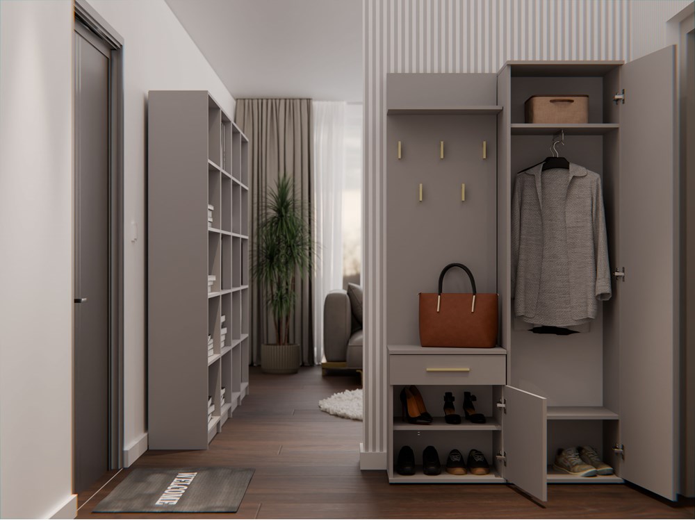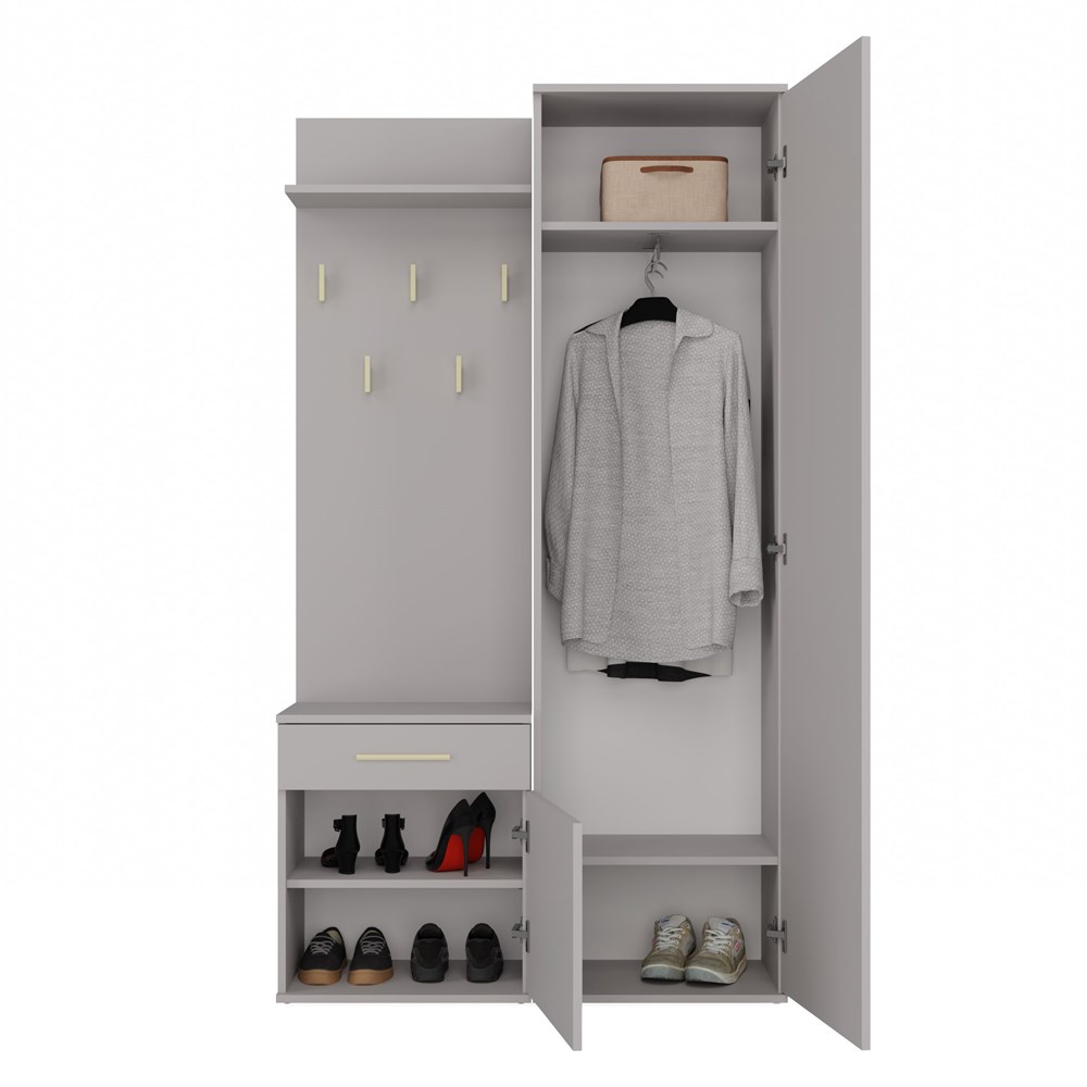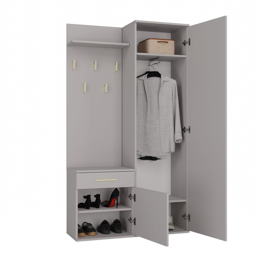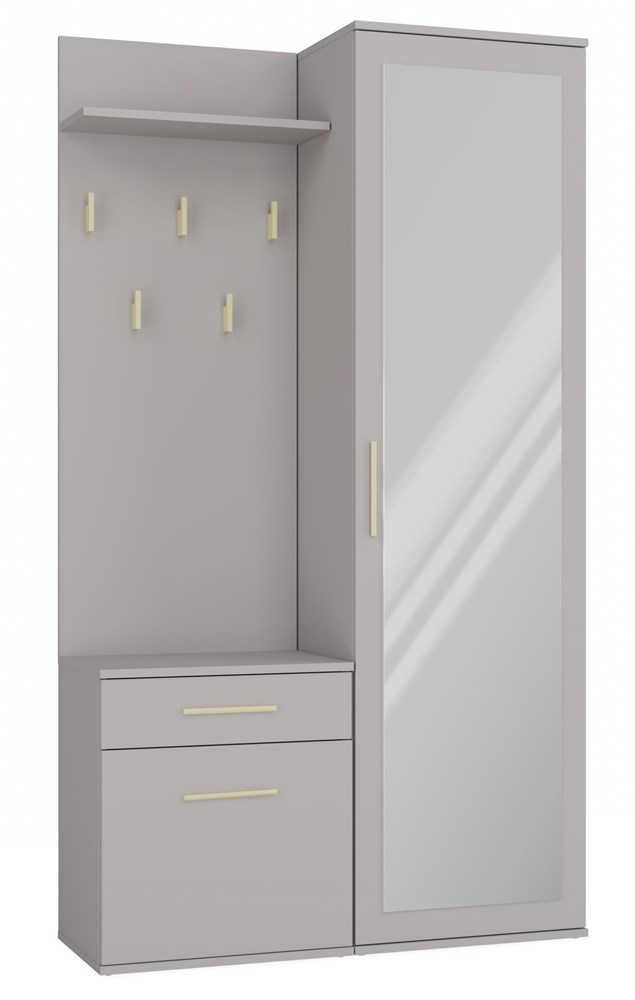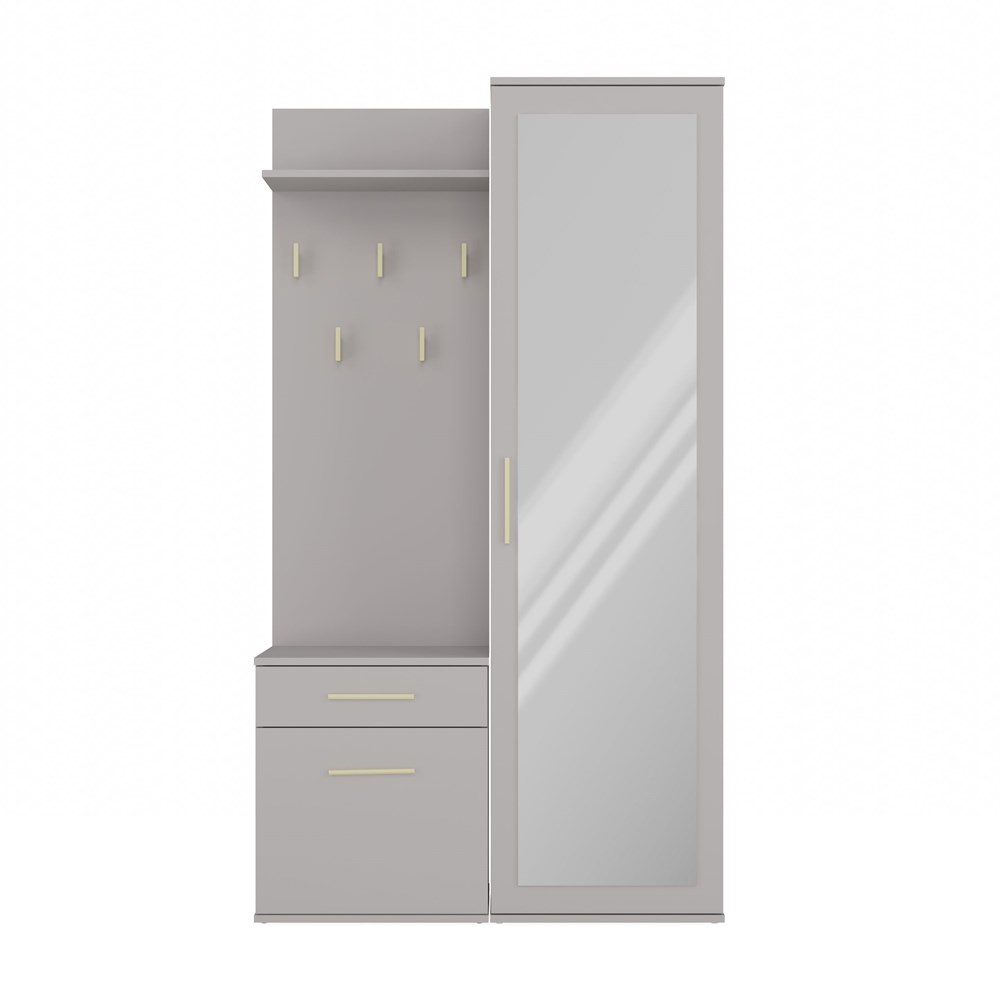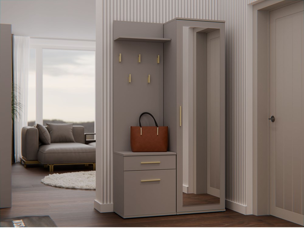 Ten zestaw, obejmujący szafę z lustrem, wieszak z półką oraz szafkę z drzwiczkami i szufladą, stanowi doskonałą propozycję dla osób poszukujących stylowych rozwiązań do aranżacji garderoby. To elegancki, nowoczesny mebel, który zaspokoi potrzeby tych, którzy cenią prostotę połączoną z wyrafinowaną elegancją.