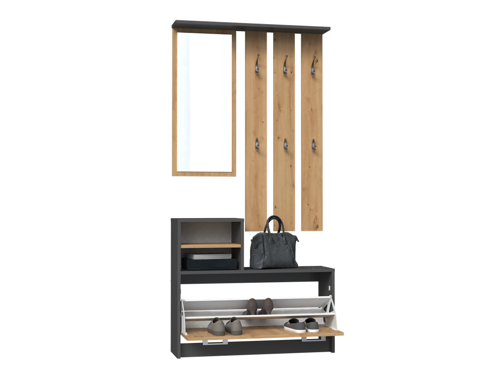 • Szafka na buty z siedziskiem i schowkiem: funkcjonalna szafka, która pomieści buty, a także oferuje wygodne miejsce do siedzenia.
