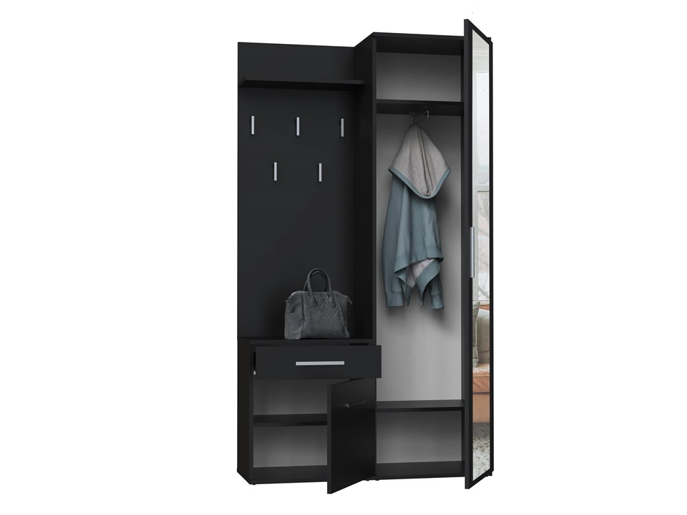 Szafa oferuje mnóstwo miejsca do przechowywania, co czyni ją niezastąpionym elementem wyposażenia garderoby. Zawiera praktyczną szufladę, przestronną szafkę z drzwiczkami oraz wieszak z półką i pięcioma haczykami – wszystko to pozwala na wygodne rozmieszczenie odzieży i akcesoriów. Możliwość montażu drzwi na lewą lub prawą stronę daje dodatkową elastyczność w planowaniu przestrzeni.