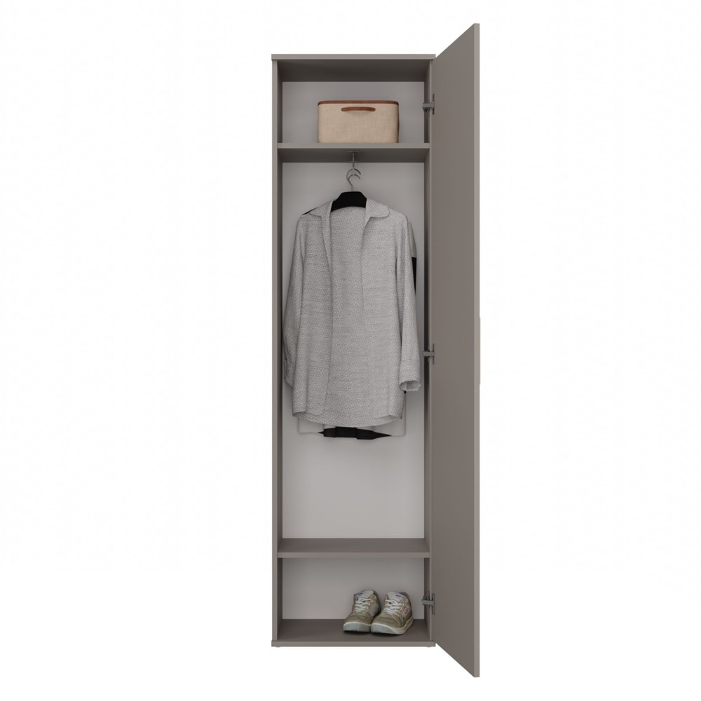 • Praktyczne wnętrze: Wyposażona w dwie pojemne półki oraz uchwyt na wieszaki, zapewnia wygodne przechowywanie ubrań i akcesoriów.