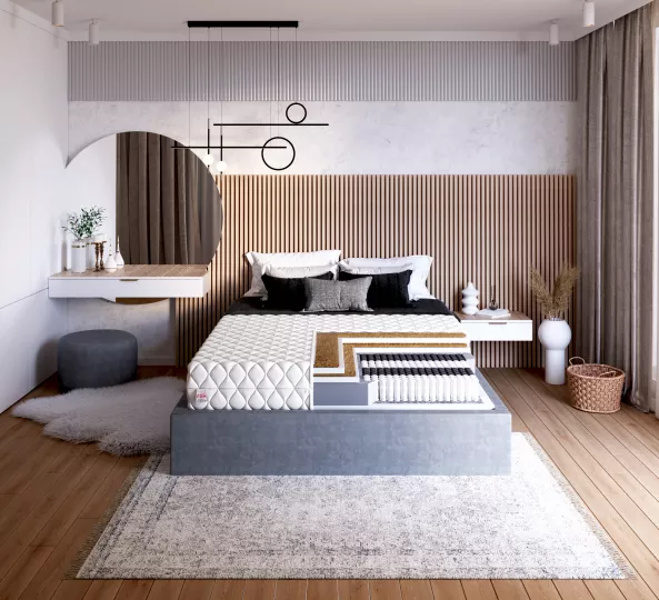 - Dwustronna twardość – jedna strona H3 (średnio twarda), druga H5 (bardzo twarda), umożliwia dostosowanie materaca do indywidualnych preferencji.
