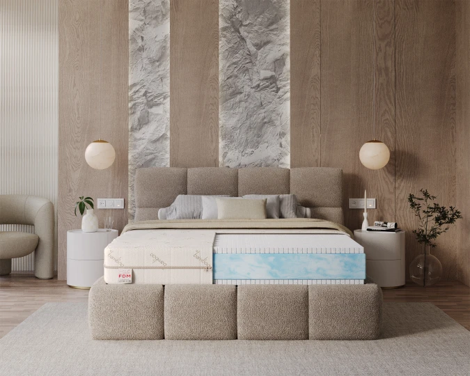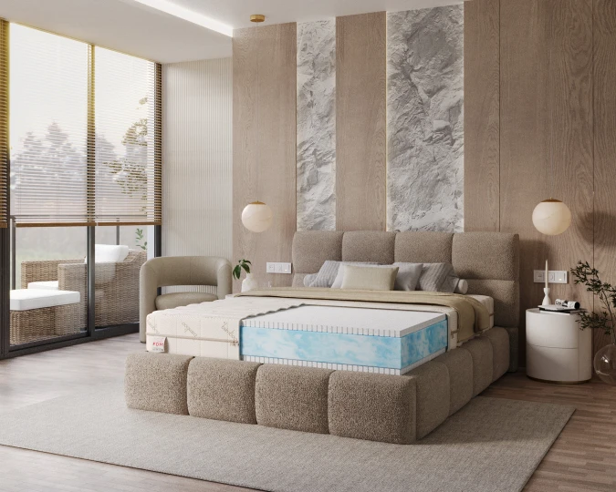 Model MIRROR wyposażono w dwie warstwy lateksu OCEAN BLUE GEL – materiału, który wyróżnia się obecnością mikrokapsułek żelu chłodzącego. Kapsułki te pochłaniają ciepło i wilgoć, zapewniając przyjemną temperaturę nawet w upalne noce.