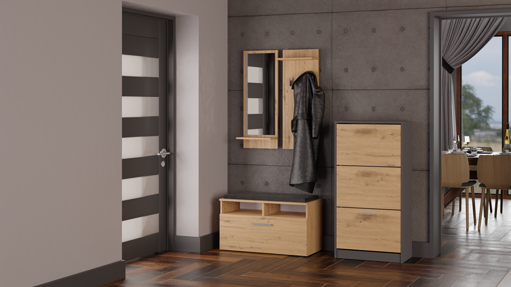 Szafka na buty Nubo to połączenie nowoczesnego stylu, funkcjonalności i starannego wykonania. Kontrastowe zestawienie kolorów Antracyt oraz Dąb Artisan nadaje meblowi wyjątkowego charakteru, dzięki czemu świetnie wpasuje się w przedpokoje urządzone w stylu loft, modern, skandynawskim czy minimalistycznym.