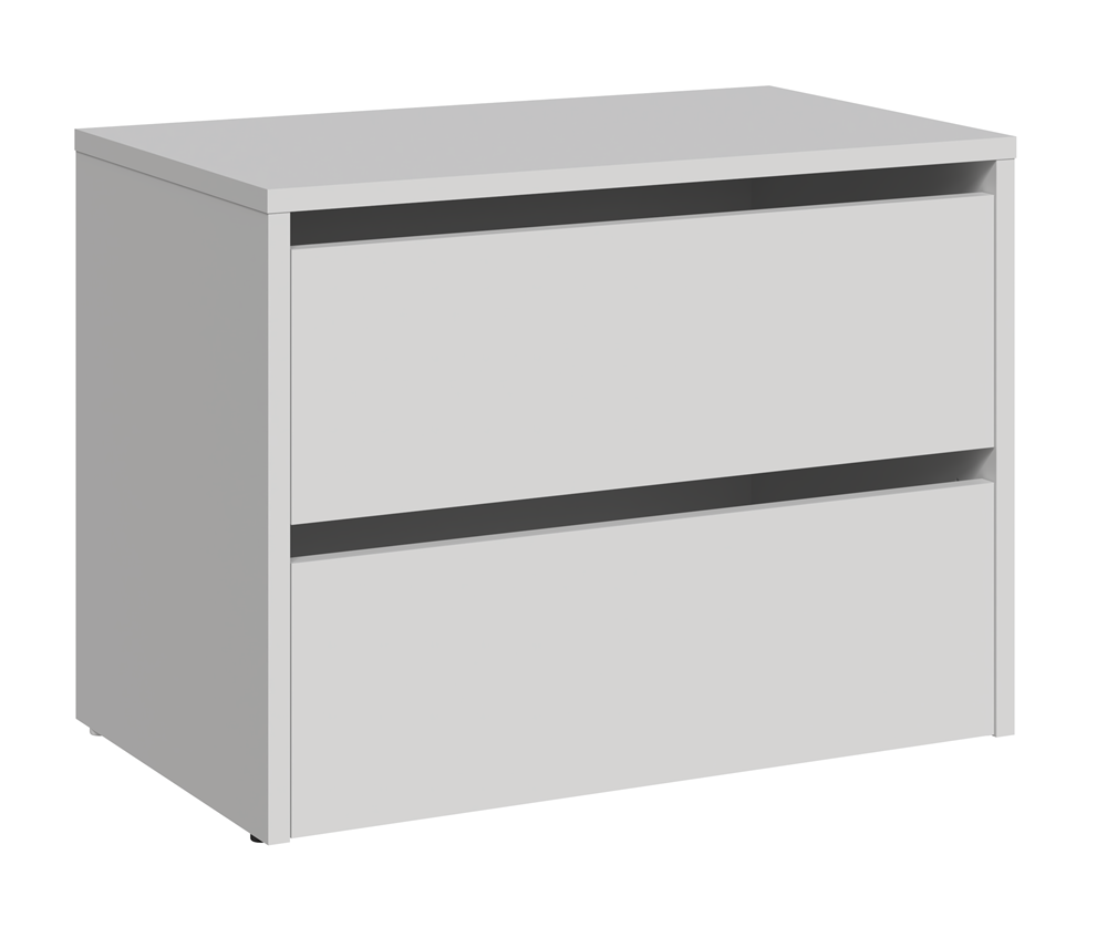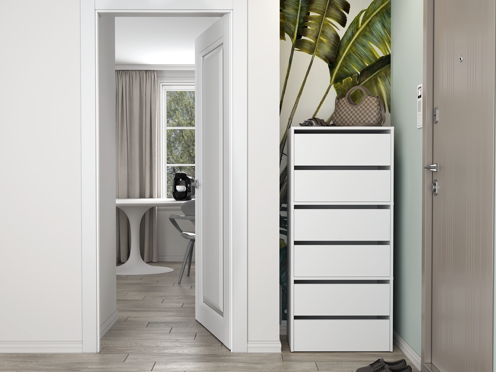 Uchylne drzwiczki ułatwiają dostęp do wnętrza, w którym znajdują się 2 praktyczne, pojemne półki na obuwie. Brak uchwytów podkreśla czysty, nowoczesny design, doskonale pasujący do jasnych, minimalistycznych przedpokojów.